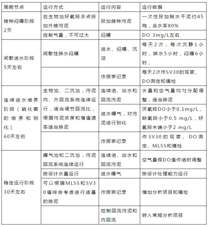 在污泥接種期間,每天間歇進水四次,為污泥增生殖提供營養物質;同時減少排泥甚至不排泥。污泥培養與馴化具體周期安排見下表: