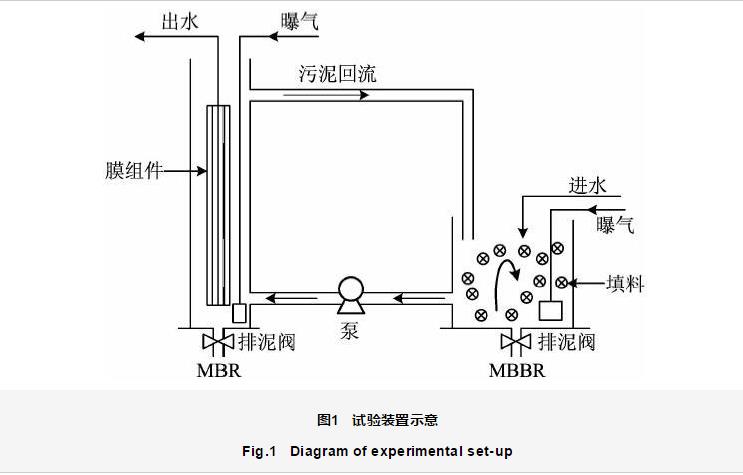 試驗裝置如圖1所示。整套裝置由MBBR和MBR串聯而成,總有效容積為7 L。從圖1可以看出,2個反應器均為圓柱形容器,底部均設有排泥閥,在MBR與MBBR之間設有污泥回流管道。MBBR中所用填料為直徑15.0 mm的聚乙烯材料,填充比為30%。MBR中膜組件所用膜為中空纖維膜,膜孔徑為0.4 μm,總有效過濾面積為0.02 m2。MBR和MBBR均設置了沙球曝氣器,給混合液充氧,使反應器中混合液溶解氧(DO)濃度保持在6.0~7.0 mg∕L,曝氣過程中還可以產生水力剪切力和攪動混合液,進而減緩膜的污染。曝氣量由玻璃轉子流量計調節,使其保持在1.0 L∕min。通過每天排放剩余污泥控制污泥齡(SRT)為80 d,水力停留時間(HRT)為17 h。反應器接種污泥取自北京某污水處理廠。