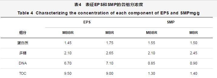 表征EPS和SMP的各組分濃度如表4所示。從表4可以看出,在MBBR和MBR反應器中,以TOC表征的EPS濃度最高,以TOC表征的SMP濃度較低。DNA是EPS的重要組分,在MBBR和MBR中濃度分別為6.70和7.10 mg∕g。多糖是SMP重要組分,且MBR中多糖濃度明顯高于MBBR,但蛋白質和DNA濃度相差不大。