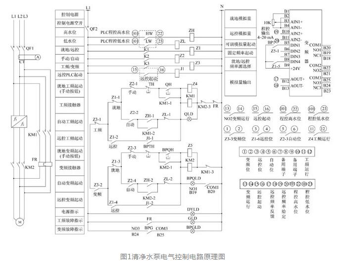 (6)清凈水泵本體擴容改進,配套電動機功率由15kW升至75kW。4設備改進后的電氣控制原理改進后的清凈水泵電氣控制電路實現如下功能:在遠方控制方式下,可從PLC程控畫面工頻起動和變頻起動水泵;在自動操作形式下水處理設備,水泵的起停受水池高、低液位自動控制,水池液位達到高水位定值(3m)時,PLC程控高水位接點閉合自動起動水泵,水池液位降至低水位定值(1.5m)后,程控低水位接點閉合自動停運水泵;在變頻運行模式下,可從水泵就地控制柜和PLC程控畫面調節變頻器輸出頻率。
